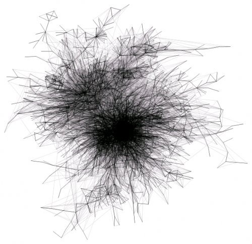 The dark edges show the reciprocal links, the lighter edges indicate a-reciprocal links. The larger, denser area of the graph is that part of the blogosphere generally characterised by socio-political discussion. From Mapping the blogosphere. [via]